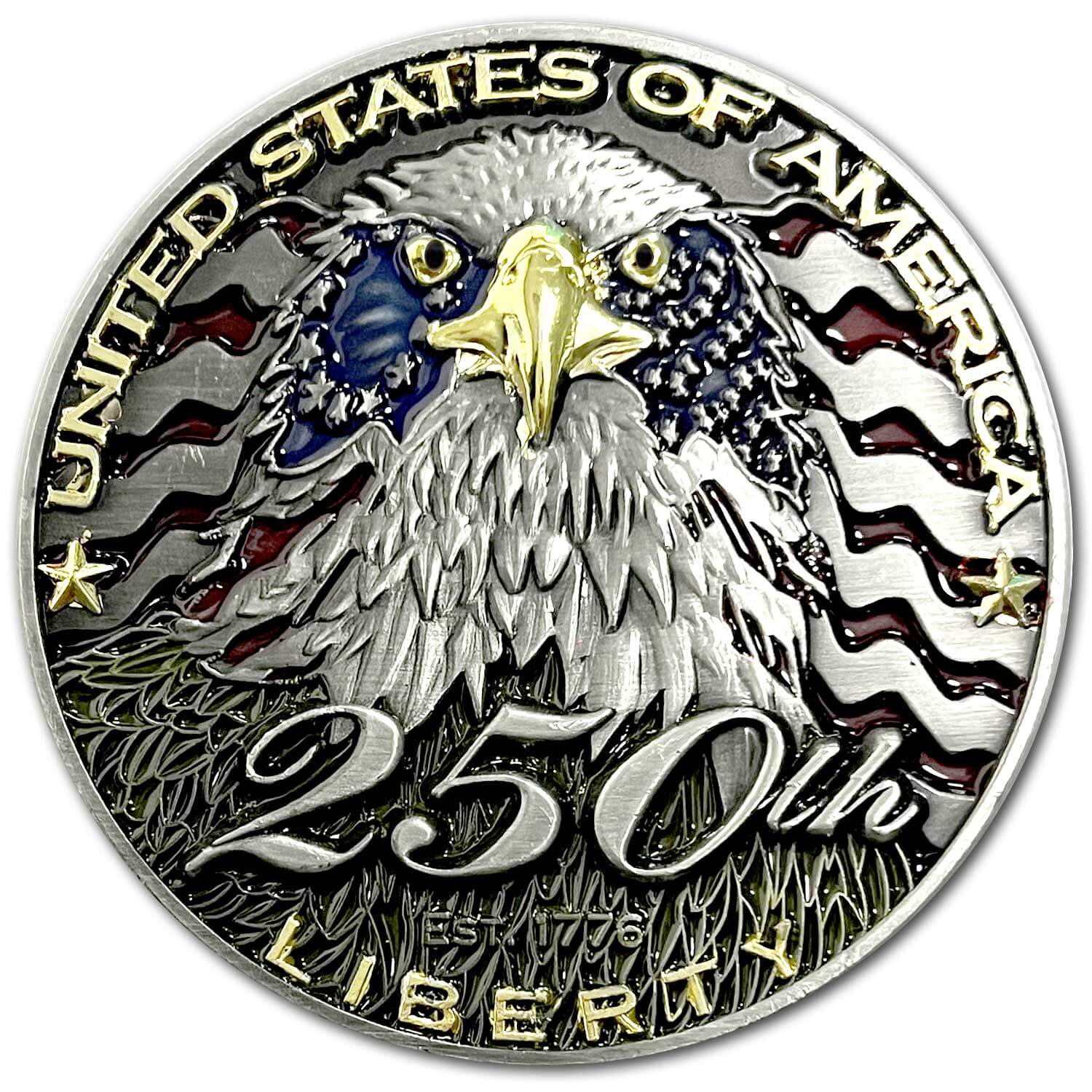 USA 250th Anniversary Birthday Spirit of 76 Patriotic Veteran Collectible Challenge Coin symbolic of this countries desire to be self ruled and fight at every turn to defend its freedoms and way of life. The USA 250th Anniversary Birthday Spirit of 76 Patriotic Veteran Collectible Challenge Coin was designed to recognize our proud heritage as Americans and those seeking American citizenship.